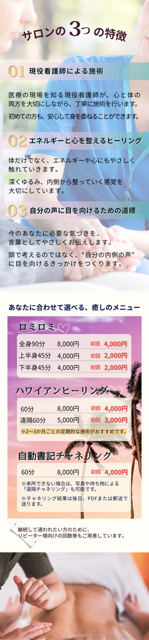 お悩みや今の状態に合わせて、当日ご相談しながら内容を決めることも可能です。