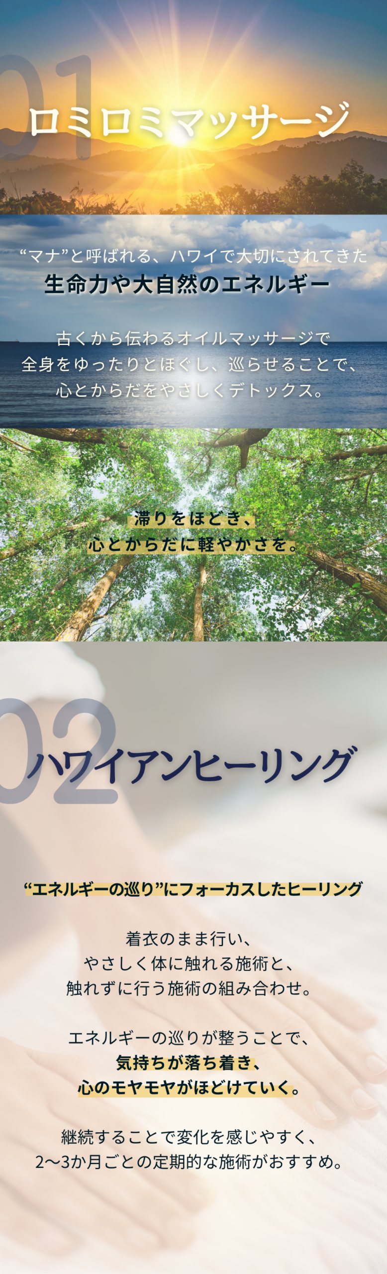 ハワイアンヒーリングは、着衣のまま行います。ウエストを締め付けない、やわらかい素材のパンツでお越しください。ジーンズやタイトなパンツ、スカートで来られた場合は、お着替えのご用意もありますのでご安心ください。